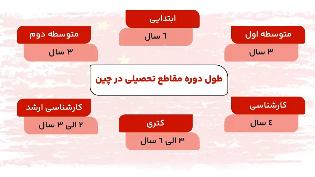 - برای پذیرش کارشناسی در چین داشتن مدرک تحصیلی 12 ساله تحصیلی ضروری است. ( طول مقطع کارشناسی از 3 الی 4 سال متغیر می باشد. )